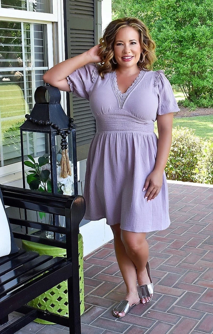 This dress is at the top of our must have list this season! It features a stunning, soft lavender color with the most flattering design. It features more open cut sleeves to add a bold pop, while the design at the waist truly cinches you in. If larger in the bust, we do recommend sizing up to ensure the best fit. You are going to love this one!
