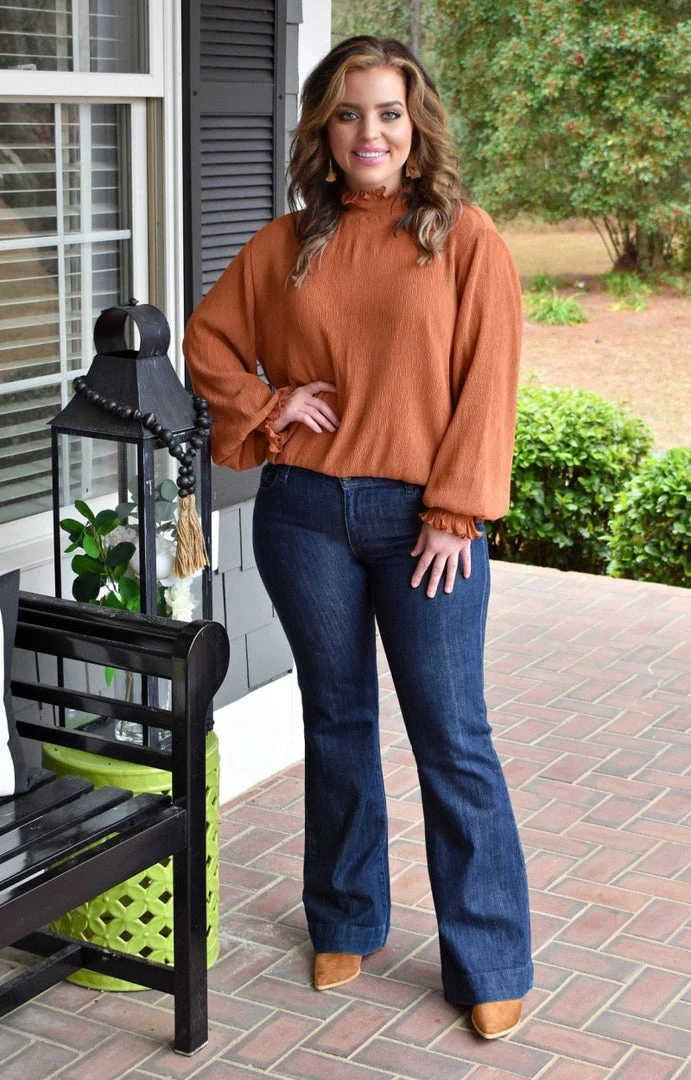 This little terra cotta top is just the perfect little color for pairing with our dark wash jeans. This one has a flowing design with a more open cut sleeve and fitted detailing near the wrist and the neck area to add a pop of flare. Throw on a statement earring and enjoy the endless layering options this one brings!