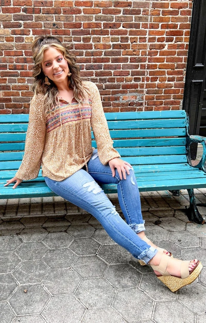 This little print top is just what you need for your next weekend ready look! This one features embroidered detailing along the front with bold colors to make you stand out. This one runs true to size with a flowing cut. Grab yours with your favorite PPB jeans and get ready to turn heads!