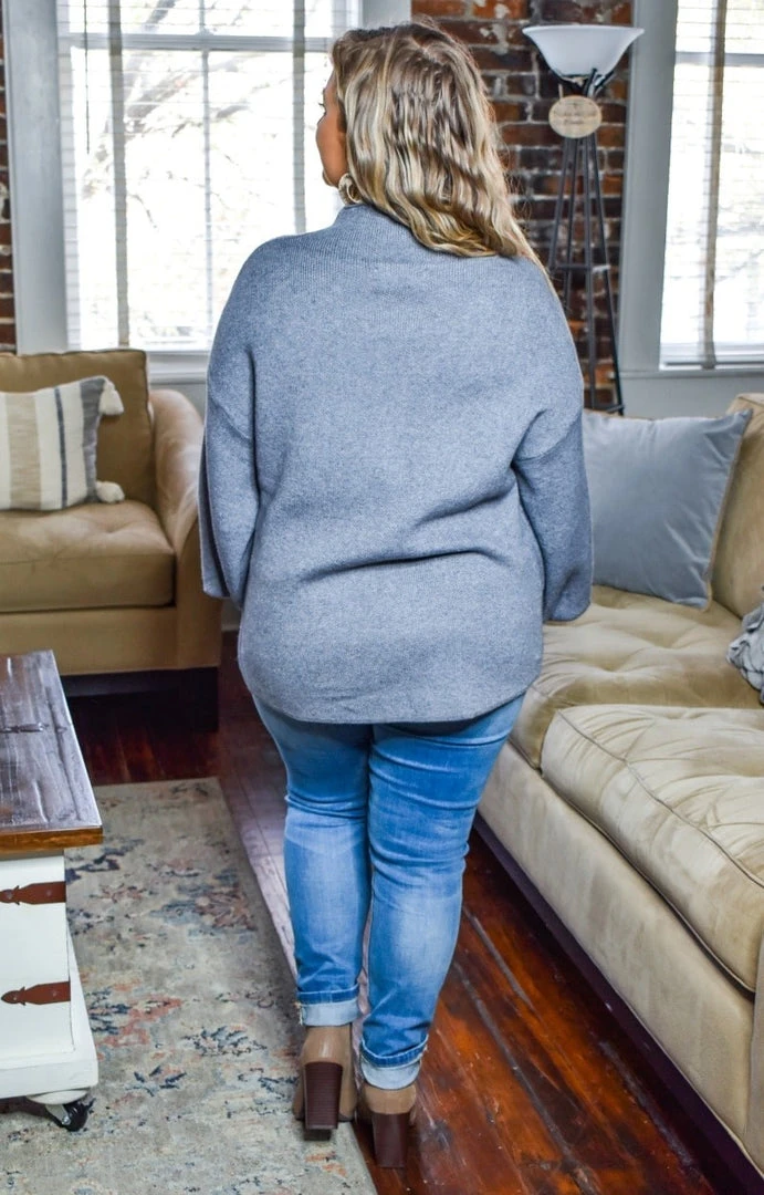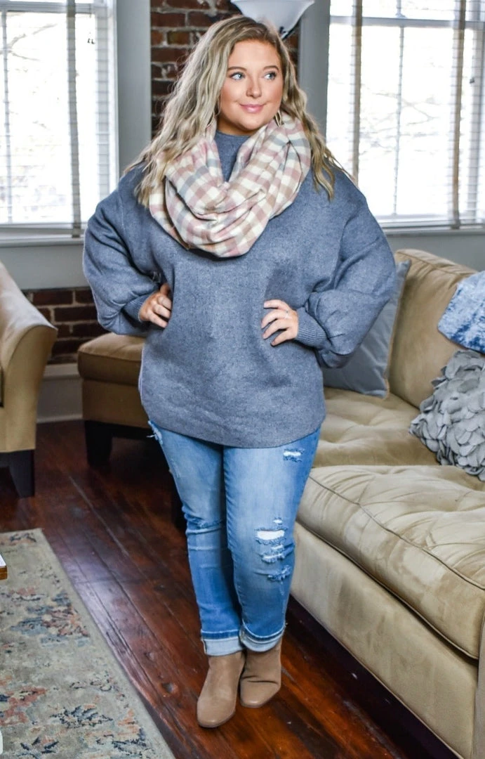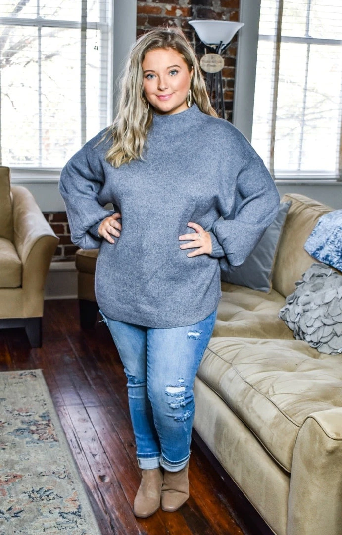 This sweater is so stylish and chic and looks amazing with our new jeans! This one has a thicker style material with a more open cut and stretchy feel. It has a neckline that has a turtleneck style cut that hits more loosely around the neck. The sleeves have a dramatic puff like design to give a stylish flare. They become more fitted as it nears the wrist area to further accentuate the flare sleeve design. Grab yours and get ready to turn heads!