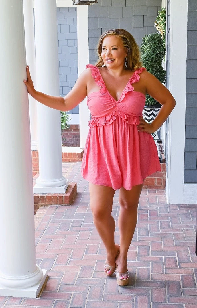 Stay girly and fun in this absolutely adorable little romper! It features a beautiful pink color with ruffle accents throughout that give it a more dramatic pop. This one also has a stretchy, scrunched panel design along the back to offer comfort and stretch to the bust area. It has shorts lined underneath for added coverage. You need this one!