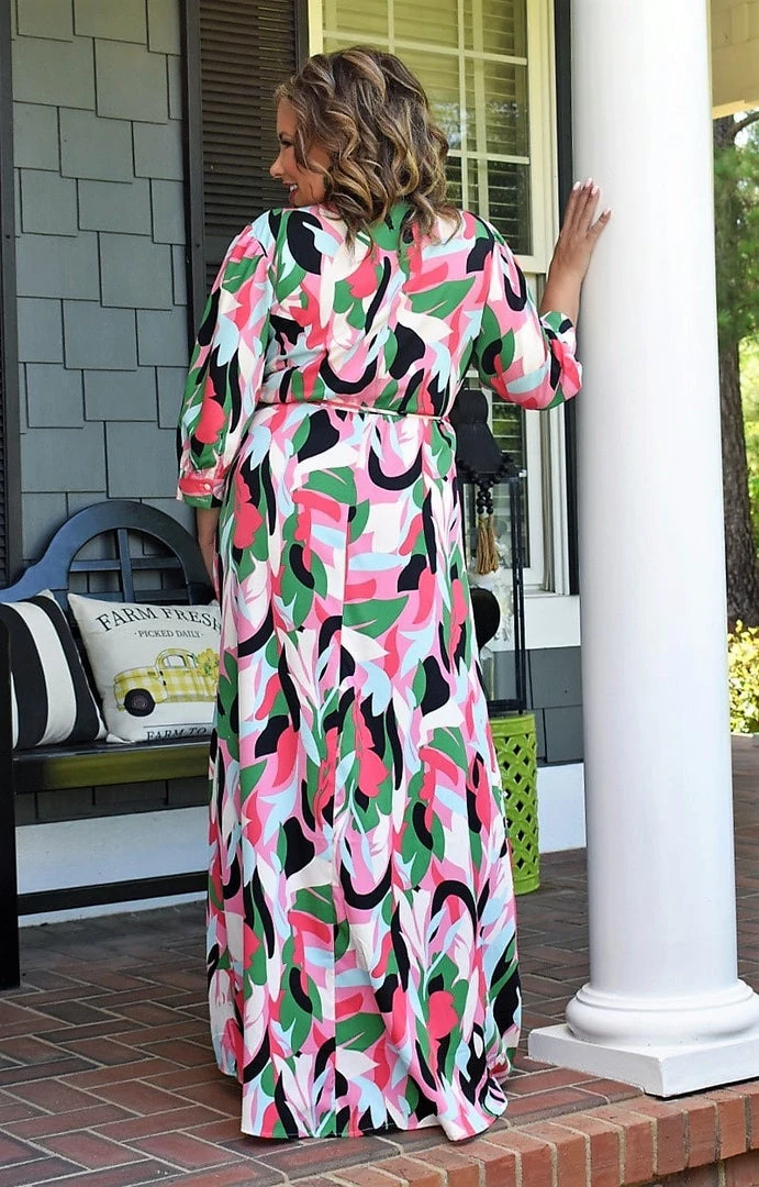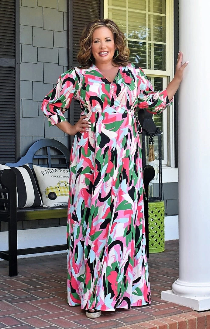 You are sure to be printed to perfection in this beautiful print maxi dress! This stunner features a true wrap style design that makes it custom to your shape to cinch you in like no other. The puff like sleeve adds such a cute pop. This one runs true to size, but does have a banding along the bottom of the upper arm area. Throw this on with your favorite accessories and get ready for all eyes on you!