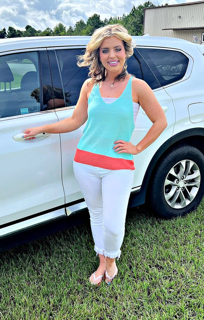 We are swooning over this must have colorblock top! This beauty features an aqua background with the perfect pop of coral along the bottom. This top has a comfy beach knit type of material with a loose fit and tons of stretch. This one is meant to be more open, and would require and sleeveless tank or bandeau underneath. The back is our favorite part! It features a twisted rope like design to give it that trendy twist. If in between sizes or smaller in the bust, we recommend sizing down with this one. You are going to love the bold color and fun design of this!