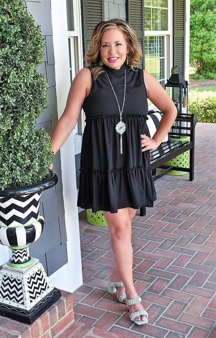 The perfect little black dress is here and ready for you! This beauty features a ruffle tiered design to add such a cute pop of drama. This dress is fully lined and has a non stretch material, so if larger in the bust, we recommend sizing up one size for the best fit. This stunning dress truly gives endless options for pairing, so grab yours before its gone!