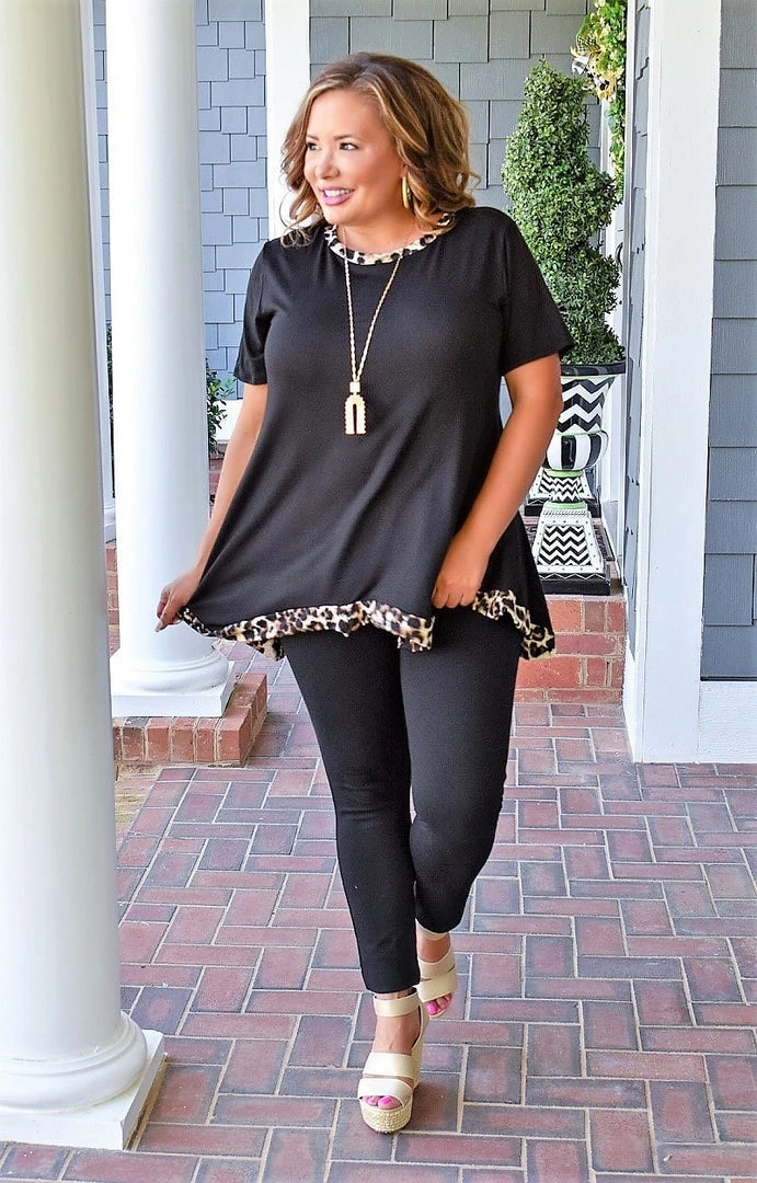 The cutest everyday top is here and begging to be added to your closet! We love the solid black color offering a slimming element with the leopard print lining the neckline and trim! This top is very light weight and breathable! You will love dressing this top up or down depending on the occasion! Don’t miss out on making this one of a kind top yours!