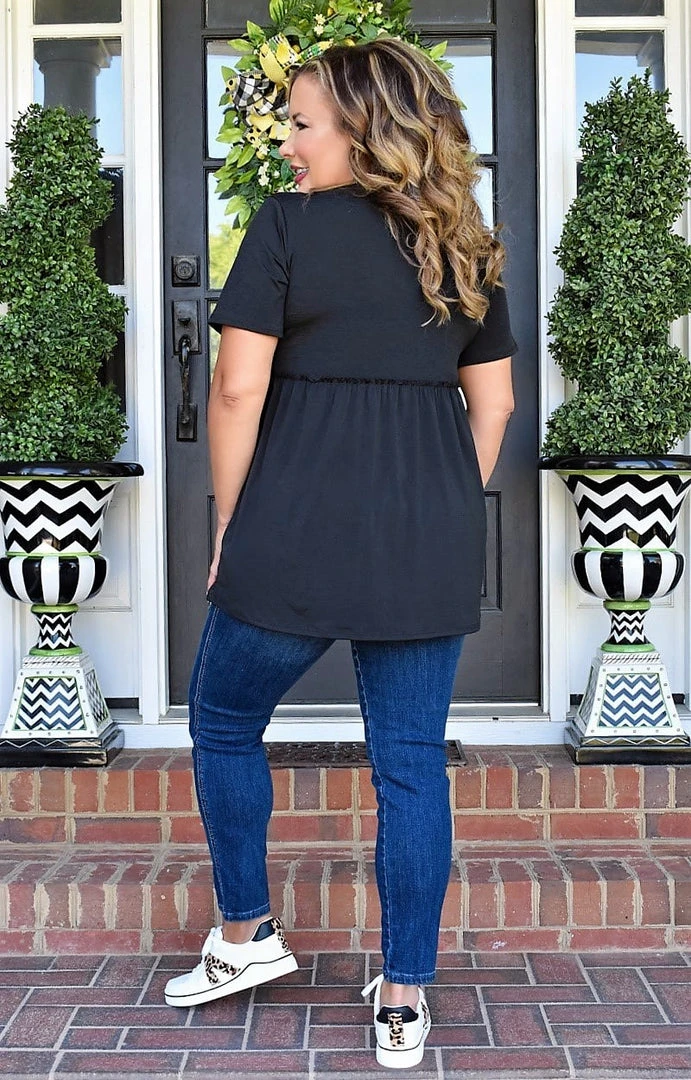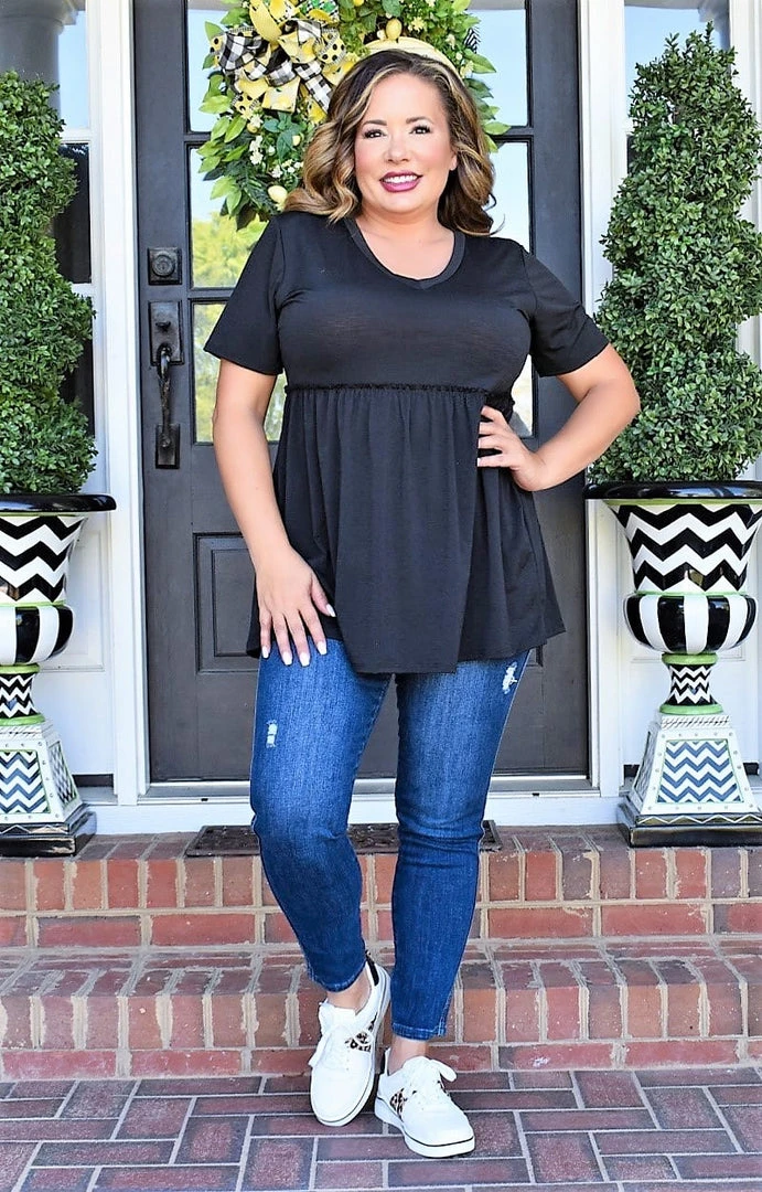 This top features a jet black color with a soft and stretchy feel. This top has a drop waist that then flows down along with a v-neck neckline. If you’re looking for both style and comfort for your next casual look, then make this one all yours before it’s gone!