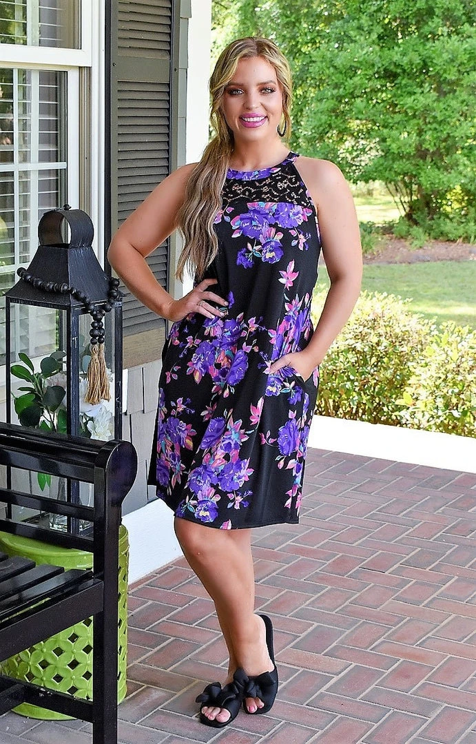 Stay fab in floral no matter where you go rocking this soft and breathable stunner! This one features our famous poly/spandex blend that is hard to wrinkle and so flattering to your shape. It even has pockets! Aside from the stunning floral print design, we also cannot get enough of the lace accents along the front and back that add a stylish pop. You need this one!