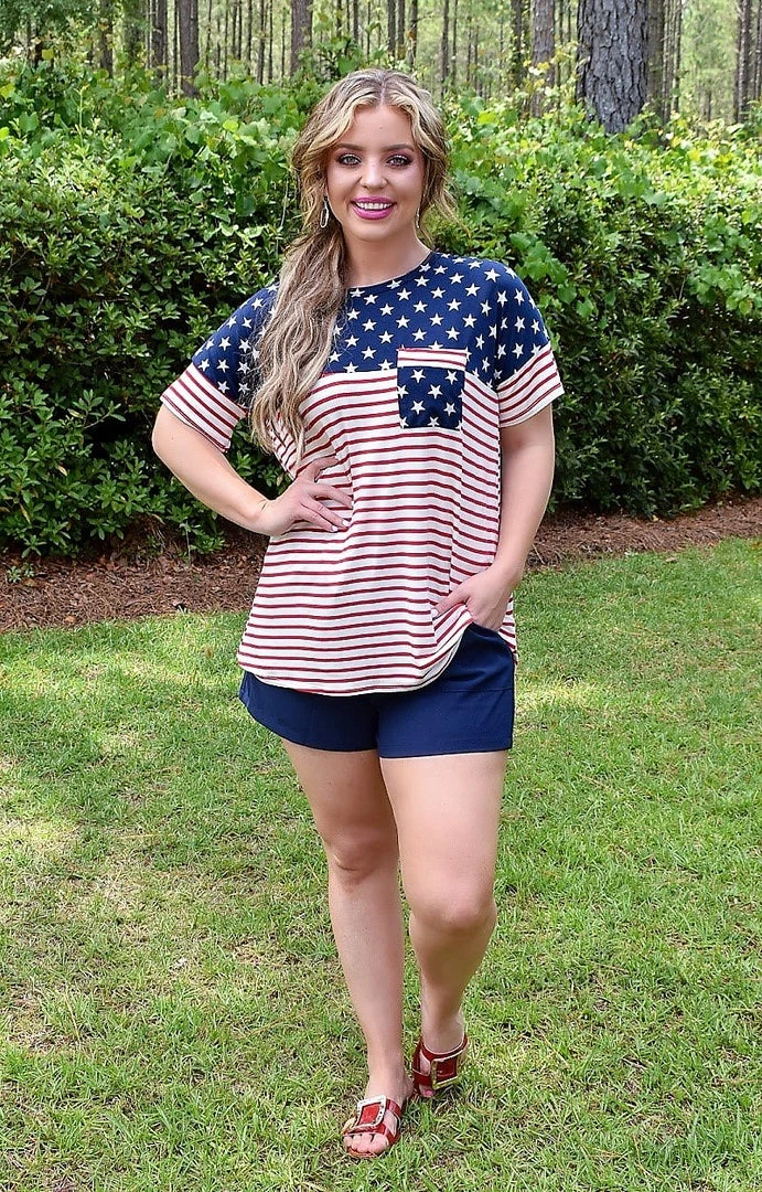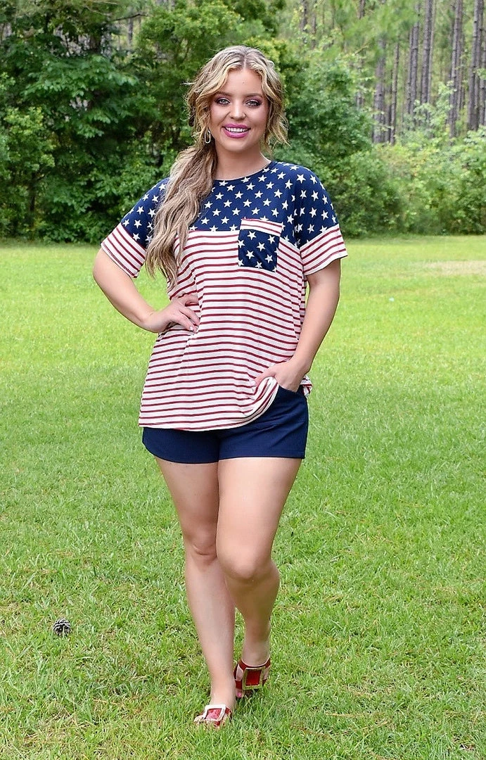 Show your patriotic side in the most fab way this season! This top features a stars and stripes design with an open and stretchy fit to flatter. The pocket design along front adds such a cute touch. Throw this on with our new navy shorts and get ready to feel comfy and trendy all day long!