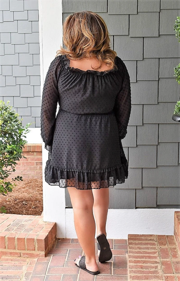 It’s no secret that every girl needs the perfect little black dress and this one exudes just that! This one features a non stretch material with an elastic style waistband that cinches in to flatter as it then flows down. The ruffle accents add such a chic pop while the minky dot detailing gives it more of a textured contrast. Grab ours with statement accessories and get ready to turn heads all day!