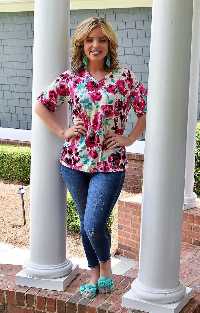 Stay fab in floral all day long in this cute little top! Featuring our famous Poly/Spandex blend, this material is so breathable and lightweight. The v-shaped neckline flatters the bust like no other. Dress this one up with our fabulous statement accessories and take your casual to the next level!