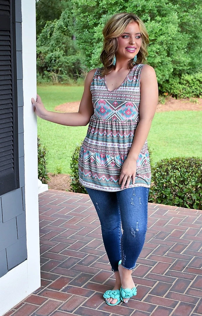 Have all eyes on you the moment you step out rocking this trendy Aztec top! The material is forgiving and light weight perfect for all day wear! The sleeveless design and v-neckline is perfect for the remaining hot summer days ahead! You will love the endless styling options this top has to offer! Don’t miss out on making this stunner yours!