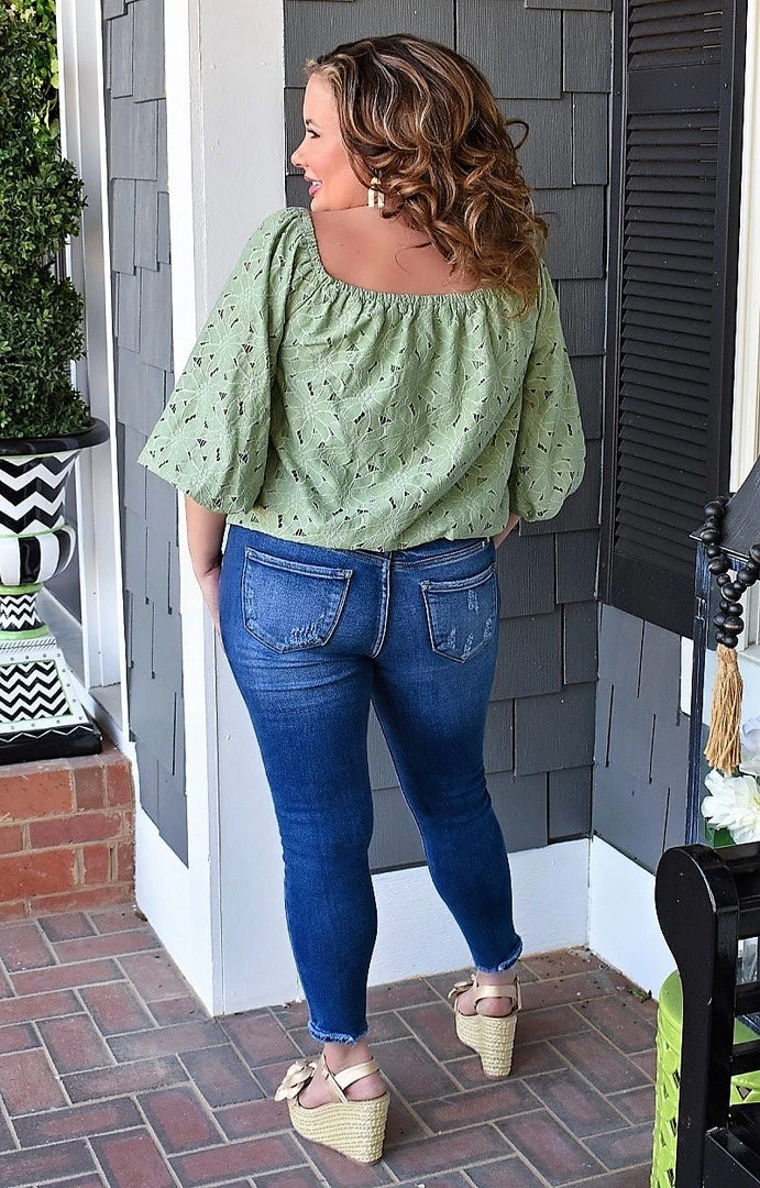 Every girl needs a go-to top for Spring and Summer and this must have is just that! We love the sage color with the floral eyelet lace design. This has stretchy bands along the neckline, and trim of the sleeves and trim keeping everything comfortably in place. Don’t miss out on making this top yours, you will love rocking it every chance you get!