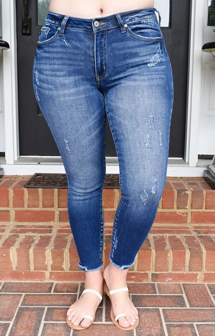 This jean comes in a faded deep blue wash with whiskering and light distress from front to back. With a mid-rise design and raw frayed hem, it’s a modern take on a favorite ankle skinny fit. Made to have just enough stretch so you can work it while wearing it comfortably.