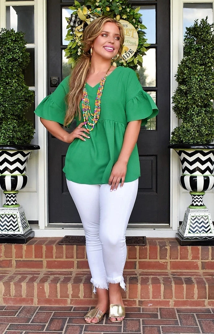 This top is just what you need to turn heads this season. It brings endless pairing options as well. This one has no stretch in the overall material, but does have a more flowing cut to flatter your shape. The sleeves have a more open cut design to add a fun pop. You are going to love this the moment you put it on!