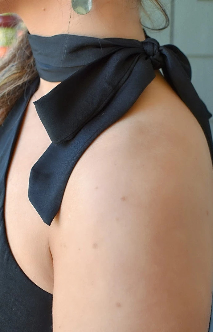 This dress is a true statement maker! We love the solid black color with the open shoulder design along one side with the tie detail around the neckline. This is cinched in along the waist by a stretchy band that keeps everything secure and in place. You are going to love the way this flatters your curves and keeps heads turning!