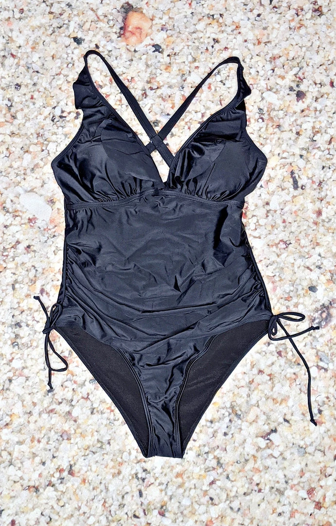 This little swimsuit features a one piece design to truly flatter and slim your shape. The ruffle accents add the cutest touch near the bust line. This one also features ruched detailing along the sides with tie accents to add more of a pop. You need this one!