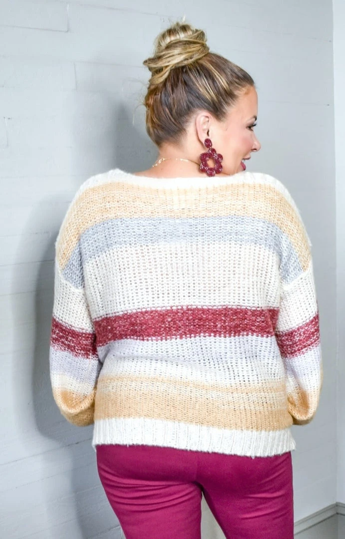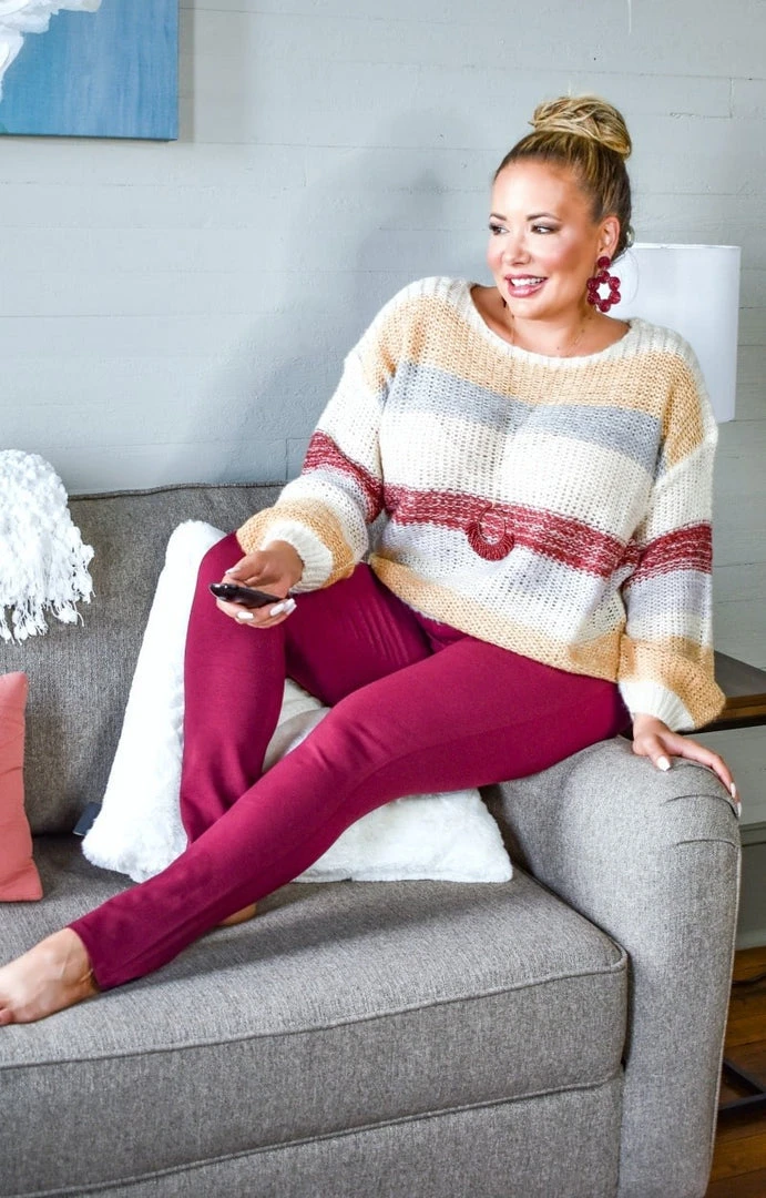 This adorable striped sweater is just what you need added to your closet this season! We are obsessing with the unique array of colors throughout the striped design truly setting this sweater apart from the rest! This stunner features a open cut slight over sized fit sure to keep you cozy on those cold days ahead! Grab this with our burgundy pants for a look sure to turn heads this season!