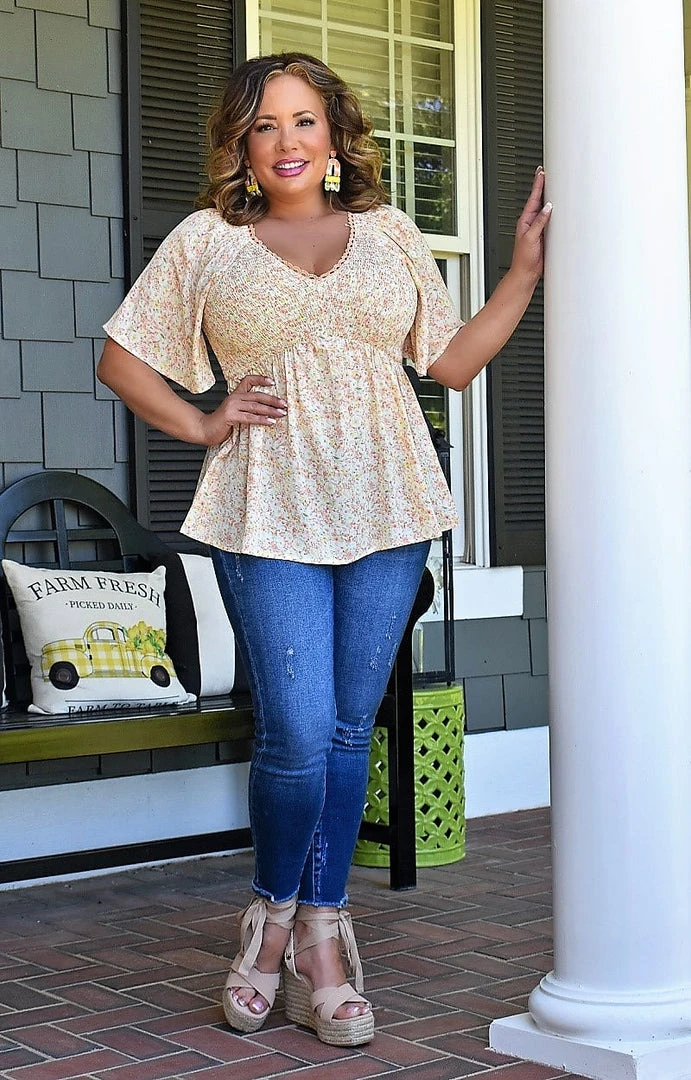 Looking for a figure flattering top that is sure to give the wow factor even on a casual day? We totally have you covered with this beautiful must have! This top features peach accents and soft colors with a dainty floral print pattern. The sleeves are more open to bring on the drama. The neckline is more open with a stretchy bust area that cinches in at the waist as it flows down to flatter. You are going to love this top the moment you put it on!