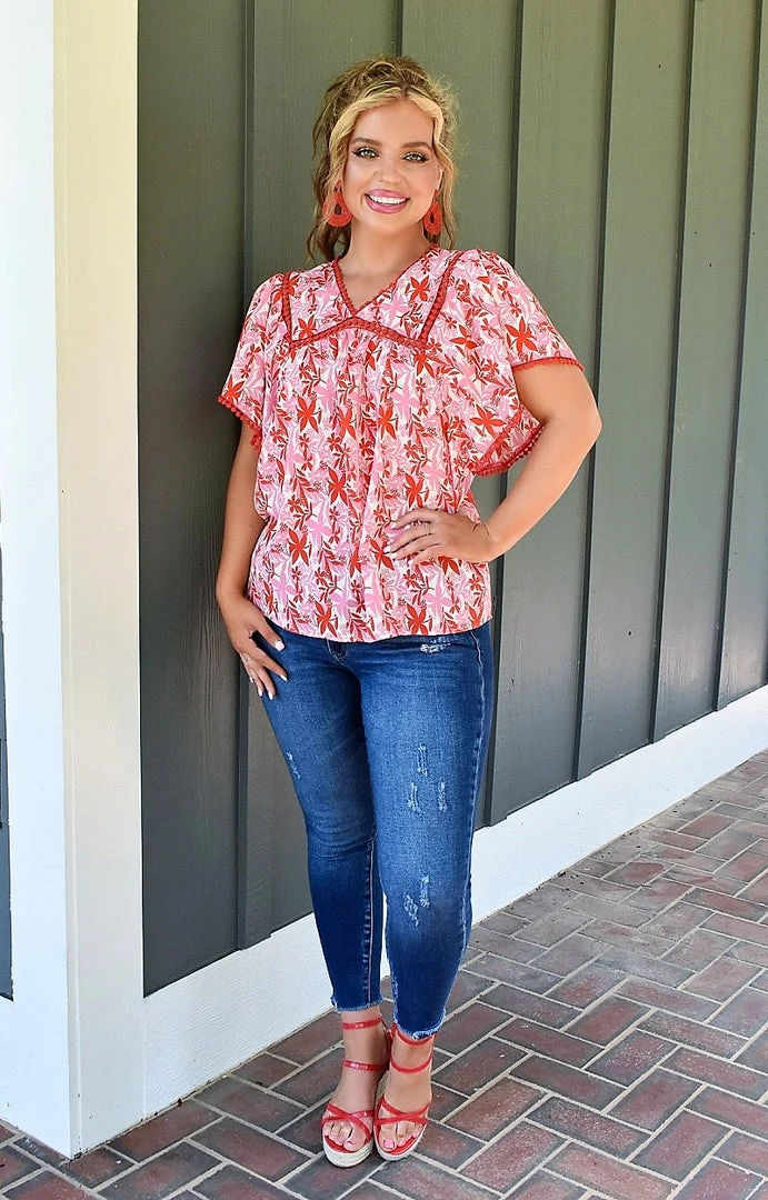 There is so much to love about this vibrant red and pink floral top! This stunner runs true to size with no stretch to the overall material. We love the rivet embroidered details lining the neckline and trim of the sleeves adding such a fun flare! Make this must have yours and enjoy all eyes on you!Â