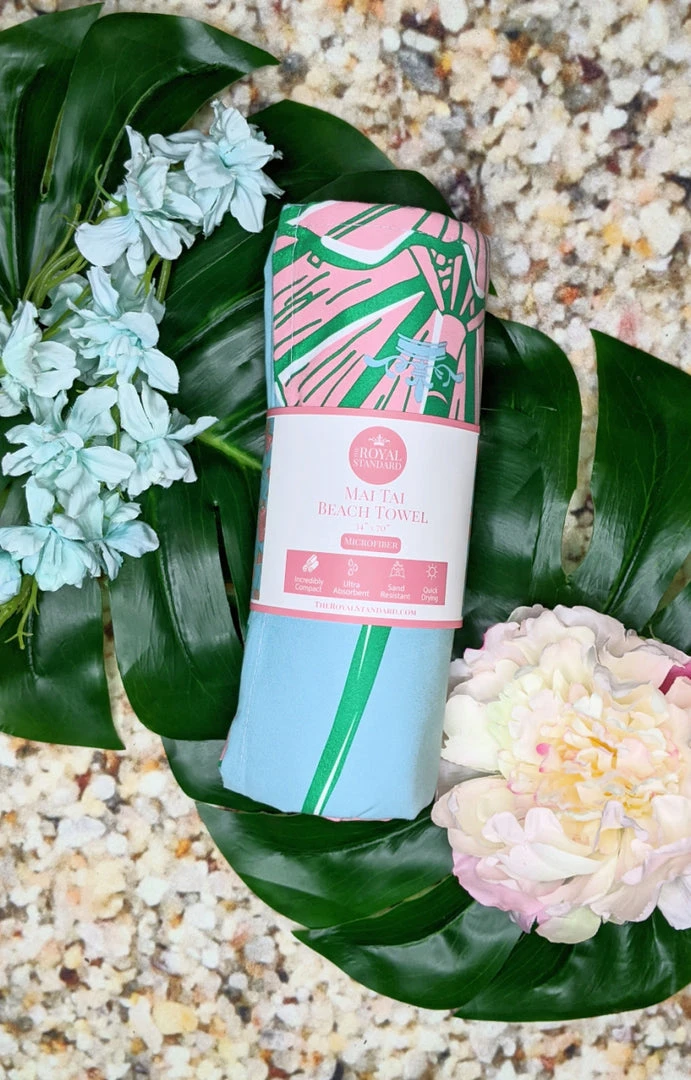 Lighten your carrying load with this aruba blue & pink Mai Tai microfiber beach towel, a lighter and more compact alternative to traditional terry cloth beach towels!. Ultra thin & compact, easy to pack and stack. Sand shakes off easily – the perfect sand free beach towel. Quick dry – much faster than a standard cotton towel and won’t collect damp smells. Super absorbent, dry off quicker.Â