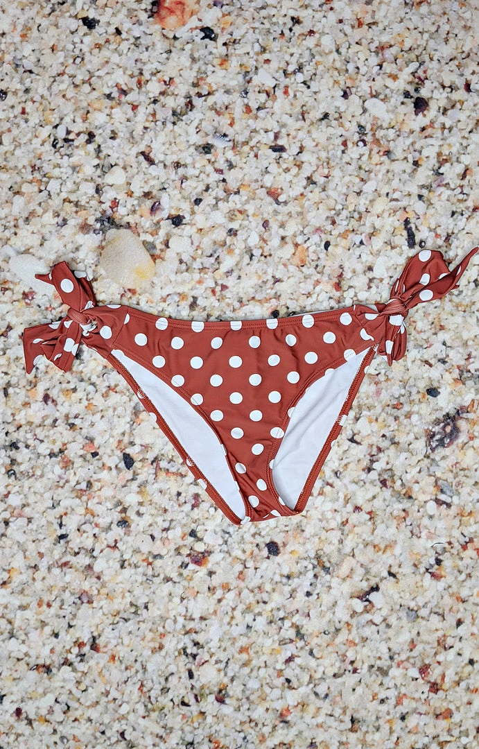 Perfect for the poolside, darling! A sexy swim bottom, this sensational pin-up piece features a marvelous white polka dot print throughout a rust red backdrop, boasting retro vibes. The low cut legs feature adjustable self tie sides and are fully mesh lined for all day comfort!