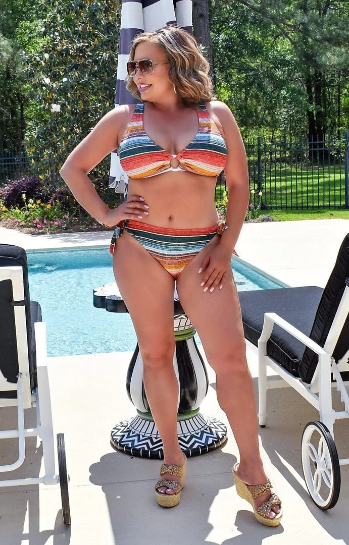 Perfect for the beach, darling! This sensational pin-up piece is set in a marvelous western print of multicolor serape stripes and boasting retro vibes. The low cut legs feature adjustable self tie sides and are fully mesh lined for all day comfort!