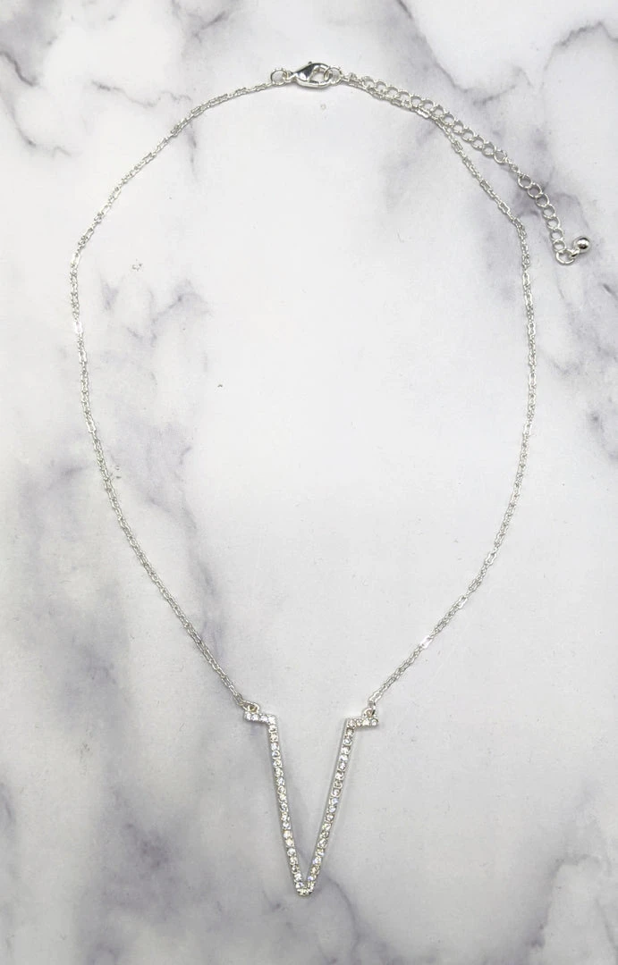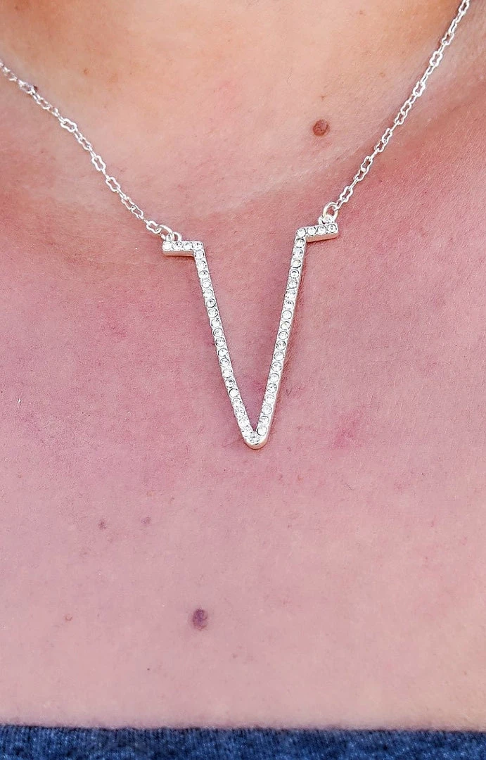 This little dainty rhinestone necklace has us completely obsessed! We love the v shape rhinestone pendant that sparkles and shines. Grab this necklace and enjoy rocking it with all your go-to PPB looks this season!Â