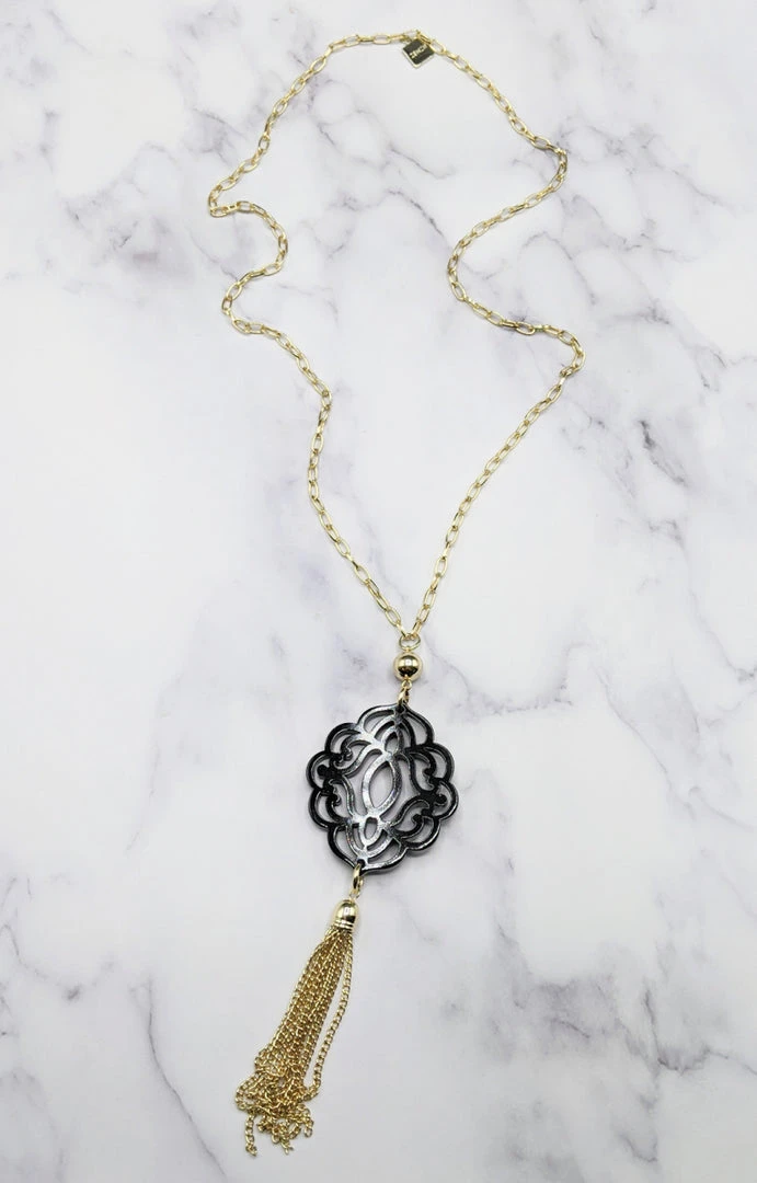 This statement necklace is sure to add a pop to your look! We love the gold chain design with the black ornate pendant truly setting this necklace apart from the rest! You will love the endless options this necklace has to offer!Â
